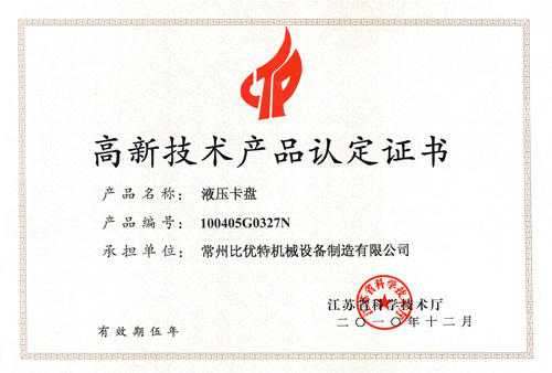 2010年12月常州“比優特”牌液壓卡盤榮獲“江蘇省高新技術產品認定證書”